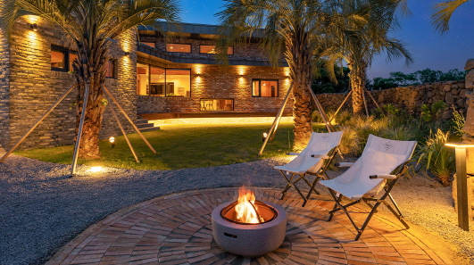 제주 중산간의 밤은 서울의 밤과는 전혀 다른 느낌입니다. 조용한 바람, 들리는 건 바람 소리와 새소리뿐. 이곳의 야외 테라스에는 불멍 공간이 마련되어 있어, 저녁이 되면 불빛 앞에서 와인 한 잔과 함께 둘만의 깊은 대화를 나눌 수 있습니다. 불멍은 단순히 불을 바라보는 것을 넘어 마음의 속도를 늦추고, 관계를 더욱 가까이 이어주는 특별한 순간을 만들어줍니다.